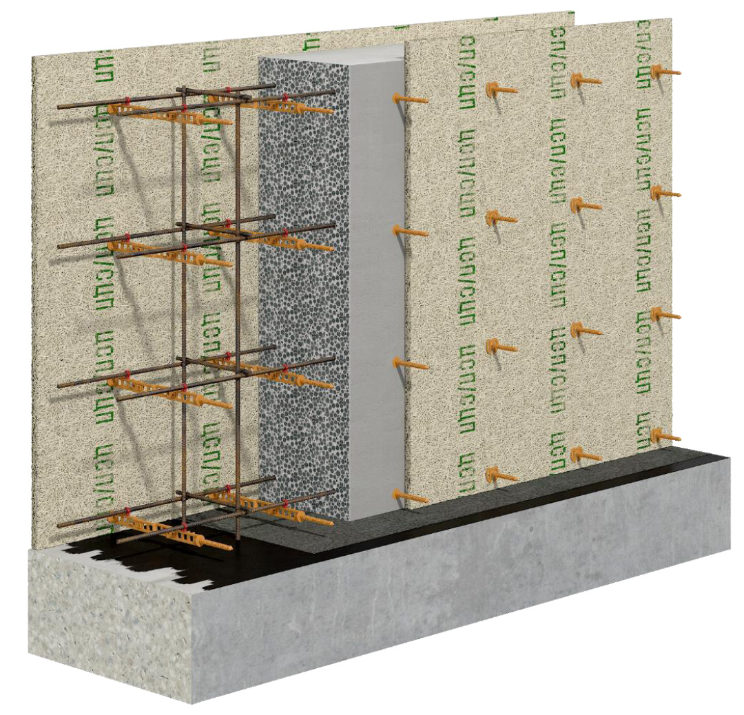 Установка Несъемной стяжки опалубки (для тяжёлых бетонов 2.3-2.5 т/м3) с шагом 40 х 40 см по горизонтали и вертикали компенсирует деформацию плитных утеплителей в опалубке. Такое расположение стяжек позволит выполнять бетонирование и вибрирование бетона в опалубке с максимальными габаритами: