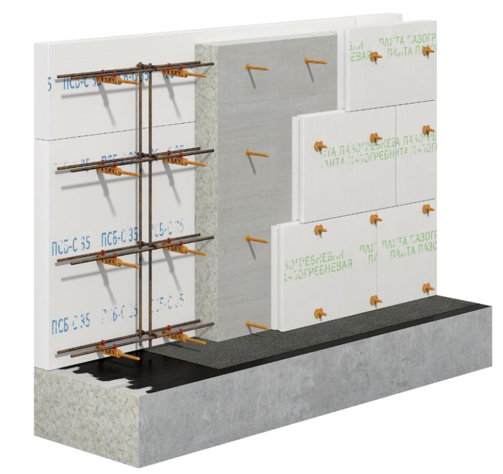 Построение опалубки всегда производить от углов (наружных и внутренних) согласно проекту. Наружные плиты необходимо выпускать за пределы плоскости стены. После бетонирования определяется общая вертикаль плоскости стены, и обрезаются все выступающие края плит теплоизоляции.