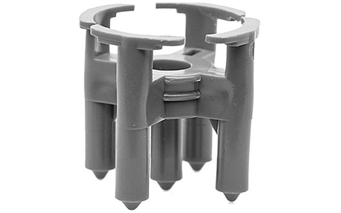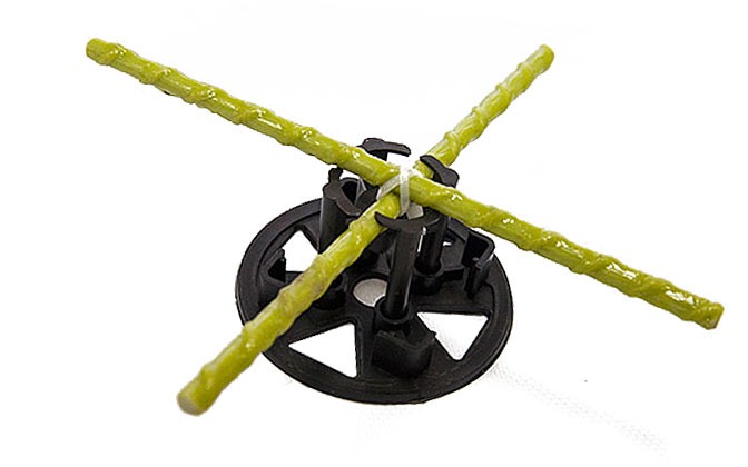 Фиксатор изготавливается из высокопрочного полиэтилена. Благодоря этому материалу фиксатор не деформируется в жаркое время года, но сохраняет пластичность при низкой температуре. Отлично работает в паре с композитной стеклопластиковой арматурой или арматурой из базальта.